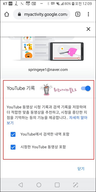 유튜브 기록을 체크해제하여 포함하지 아니할 수 있네요.